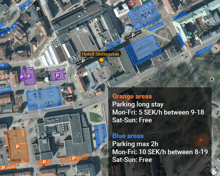 För långtidsparkering eller längre parkering dagtid, vänligen kontakta oss för att boka en plats för 100:-/dygn. Om du endast ska parkera korttid, under natten eller på helgen så hänvisar vi till allmän parkering precis utanför hotellet.